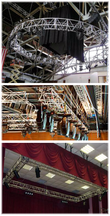 Custom Exhibit Design, Truss Creative Services, Cell Clamps, Pipe Coupler, Temporary Roofing, Rigging Tower, Concert Roof Truss, Truss Stages, Floor Trusses, Retail Display, Lighting Service, Lighting Rental, Truss Sale, Repair Service, Truss System Installation
